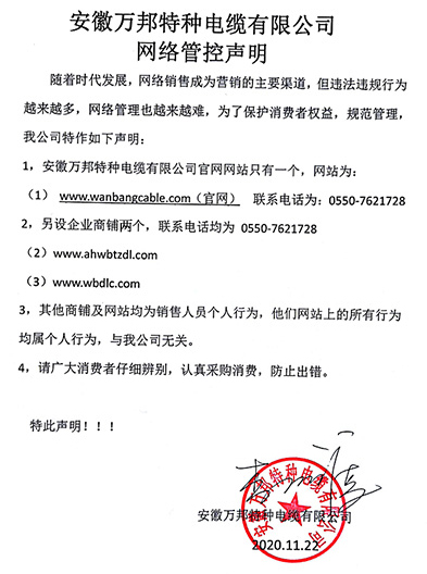 鄭重聲明:安徽萬邦特種電纜有限公司官方網站為:www_wanbangcable_com.zhpamy.com,除此之外無任何子網站或合作網站,其余均為假冒偽劣。電話:0550-7621728 13485756353 地 址:安徽省天長市滁州高新技術產業開發區經四路29號
